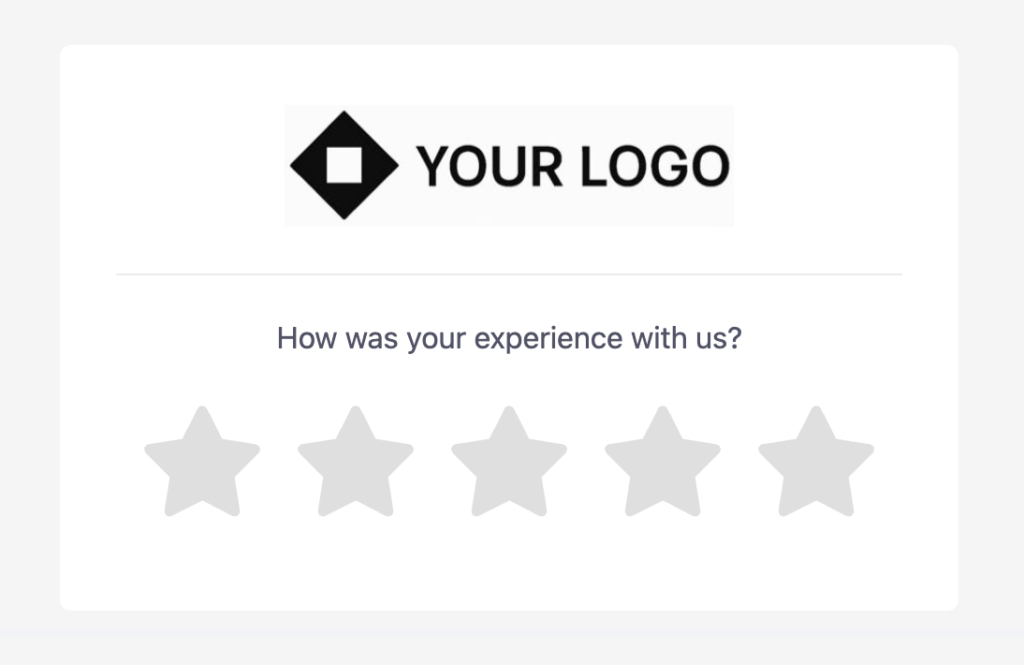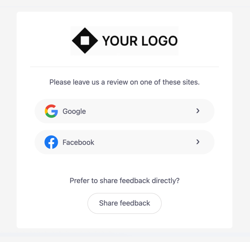 Shows customers a quick star rating (or thumbs up/down) before anything else. If they choose a positive rating, they’re shown your review links. If they choose a lower rating, they’re given a private feedback form along with your review links. This approach is helpful if you want to quickly measure customer satisfaction while still giving every customer a chance to leave a public review.